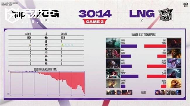 前期小龙团中,Croco皇子果断先手Junjia蔚,1xn韦鲁斯拿下一血。随后上路对拼中,sheer赛恩击杀xiaoxu铁男。先锋争夺阶段,LNG打出0换3,迅速建立4k经济领先。中期Junjia多次阵亡,厄塔汗团战中1xn再次击杀Junjia,BuLLDog辛德拉闪现EQ完成双杀。尽管GALA女枪反手拿下三杀,但依旧难以扭转战局,sheer赛恩开启大招僵直击杀GALA,LNG以3换5团灭JDG,并顺势再控厄塔汗,经济领先扩大到6k。比赛后段,龙魂团战中JDG被迫以四打五接团,BuLLDog辛德拉秒杀HongQ,LNG打出0换4轻松拿下风龙魂,随即直推JDG基地,结束比赛。